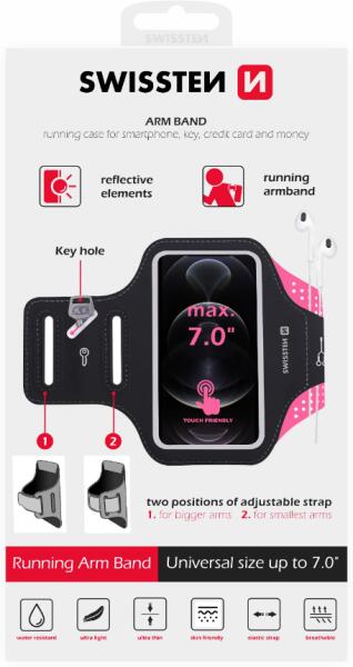 Swissten telefontartó karpánt sportoláshoz, 7.0" méret, Fekete/Rózsaszín Ez a Swissten telefontartó karpánt megoldja az összes kérdésed a személyes holmijaid tárolásával kapcsolatban sportolás közben, mert beleteheted a telefonod, bankkártyád, kulcsod, külön kivezető/elvezető rész van kialakítva a fülhallgató kábeleknek, ráadásul víz- és izzadságlepergető anyagán