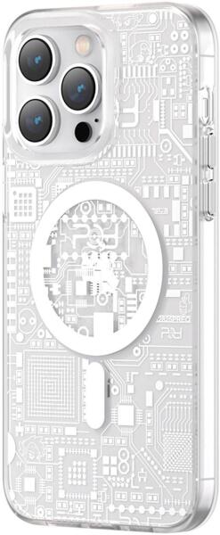 Kingxbar PQY Geek Series mágneses tok iPhone 14 Pro Max-hoz MagSafe technológiával ezüst színben Egy valódi geek számára! Ez az átlátszó telefontok egy nyomtatott áramkör textúrája által inspirált. Tartós műanyagból készült, hatékonyan védi a készüléket az esések következményeitől. Támogatja a MagSafe technológiát, amely lehetővé teszi a vezeték nélküli tölt