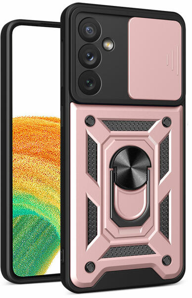 Samsung Galaxy A14 Hybrid Armor Camshield tok kamerafedéllel rózsaszínű A Hybrid Armor Camshield tok hőre lágyuló és tartós anyagból készült, amely úgy néz ki, mint az acél. A borító a Samsung Galaxy A14 készülékhez igazodik , tökéletesen védi a telefont az esések vagy karcolások (például a zsebben hordott kulcsok által okozott sérülések) ellen. A borítóban van egy