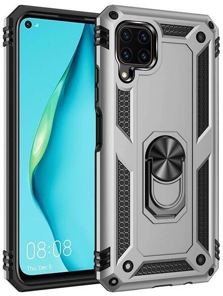 Huawei P40 Lite ezüst hibrid PC TPU Műanyag hátlap tok, közepesen ütésálló, defender, szilikon belső, telefontartó gyűrű Ezüst, TPU, PartOcean
