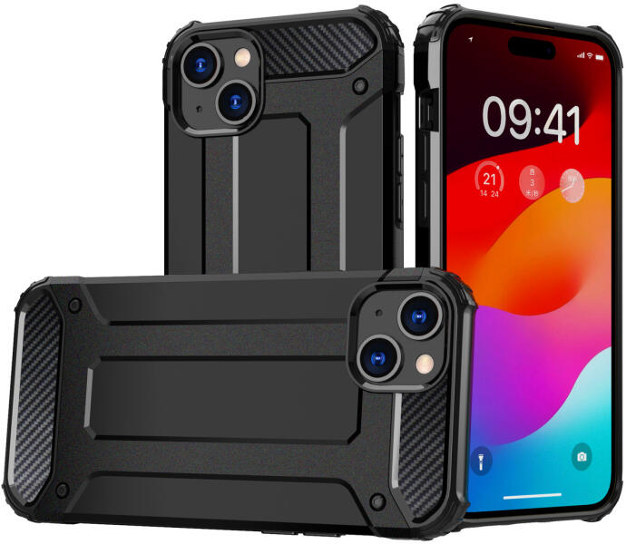 Hibrid páncél tok iPhone 15 készülékhez a Hybrid Armor sorozatból fekete színben A Hybrid Armor sorozathoz tartozó tok hőre lágyuló és tartós anyagból készült, amely homokfúvott fémet és szenet imitál. A tok az iPhone 15 készülékhez igazodik , tökéletesen védi a telefont az esések vagy karcolások (például a zsebben hordott kulcsok által okozott) sérülések ellen. A
