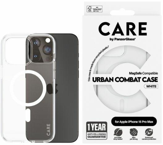 CARE by PanzerGlass Urban Combat tok iPhone 15 Pro Max 6,7" MagSafe, fehér 1420 PanzerGlass városi harci tok MagSafeA CARE FLAGSHIP sorozat a Care kínálatának egyik bestsellere. Az újrahasznosított anyagokból készült tok fenomenális védelmet, vezeték nélküli töltést és MagSafe kompatibilitást kínál. A terméket 4,8 méteres magasságból történő leejtésre tesztelték, bele