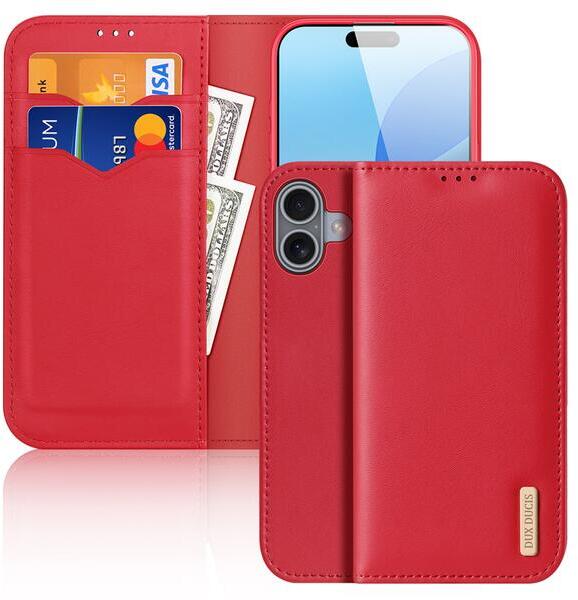 Apple Iphone 16 Dux Ducis Hivo valódi bőr Piros tok kártyatartóval
