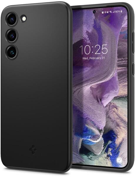 Spigen Thin Fit tok Samsung Galaxy S23, fekete Könnyű és ultravékony (1,55 mm) védőtok. TPU-ból és tartós, enyhén rugalmas polikarbonátból készült, amely megbízható védelmet nyújt a készüléknek, és javítja annak fogását a kézben. A termék tökéletesen illeszkedik, teljesen funkcionális, nem korlátozza a külső portokhoz való hozzáférést, és hatékonyan védi tel