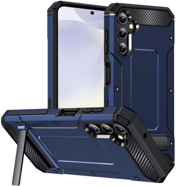 Hybrid Armor Kickstand Védőtok Samsung Galaxy S24 Plus telefonra - Sőtétkék Hybrid Armor védőtok egyedi konstrukcióval a Samsung Galaxy S24 Plus telefonra. Két részből áll: TPU odalai és a telefont körülölelő rész, valamint masszív, kemény lap a jobb védelemért leeséskor. A belsejét úgy alakították ki, hogy segítse elvezetni az ütődés erejét és a hőt a telefontól