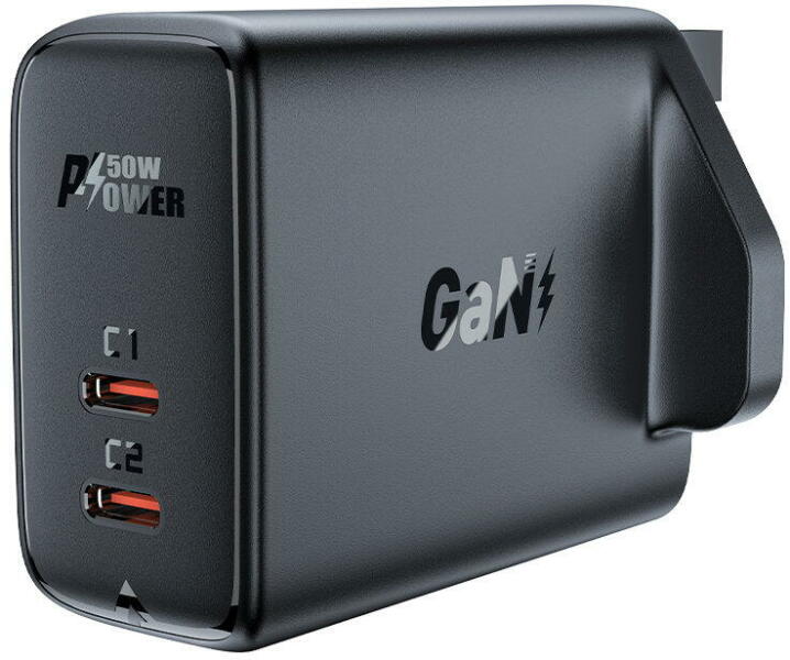 Acefast GaN töltő (UK dugó) 2x USB Type C 50W, Power Delivery, PPS, Q3 3.0, AFC, FCP fekete (A32 UK) Acefast gyorstöltő. A brit piacra szánják, brit típusú aljzathoz illeszkedik. Két USB Type C porttal rendelkezik, amelyek akár 50W-os teljesítményű töltést tesznek lehetővé. Lehetővé teszi az eszközök gyors töltését, beleértve a PPS, Power Delivery, Quick Charge 3.0, AFC