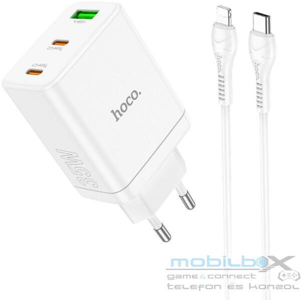 Hoco wall charger with fast charging function and triple ports: 2 USB-C and USB-A. It allows you to quickly charge mobile devices. Comes with a 1 meter USB-C - Lightning cable. The charger is equipped with triple ports: 2 USB-C (35W) and USB-A (22.5W) allow you to charge 3 devices at the same time. The product supports PD, QC 3.0, PPS, FCP, AFC and other fast charging solutions. Made of flame-reta