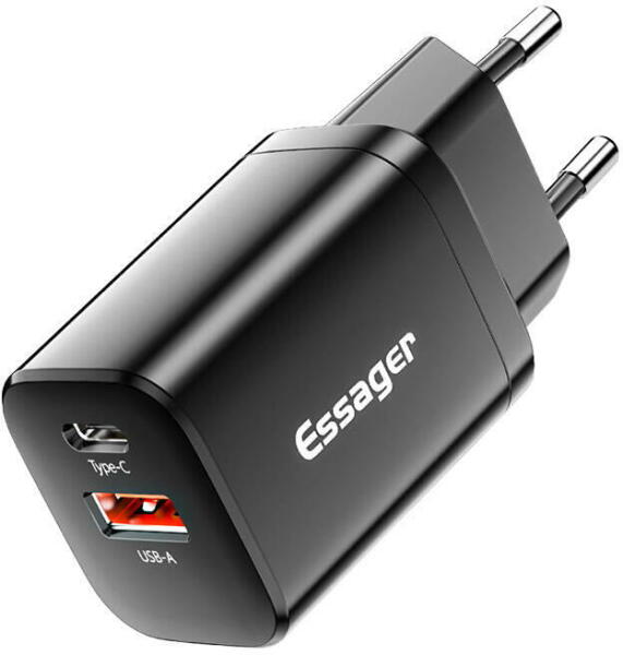 Wall Charger USB-C+USB-A 30W Essager PD+QC (black) Don't wait for one device to charge to plug in another. The Essager charger is equipped with 2 ports: USB-C and USB-A and is compatible with various fast charging protocols. This will instantly renew your equipment's energy. What's more, it stands out for its wide compatibility and offers a number of safety features to protect your device from dam