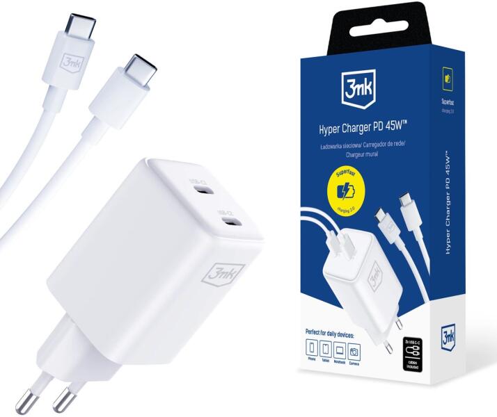 3mk Hyper Töltő PD 45W Minden egyben töltőkészlet Szupergyors – több protokollt is támogat, beleértve a Samsung Szupergyors Töltés 2.0-t Biztonságos – a PD, QC és PPS révén a gyors töltés együtt jár az akkumulátor védelemmel Kompakt – GaN technológia ötvözi a nagy teljesítményt kis, könnyű formában Minden egyben – 2 dedikált USB CC kábel tartozik hozzá a gyor