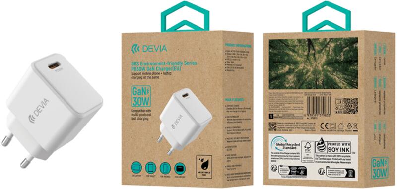 Kategórianév: Töltő Leírás: Kapacitás: 30W Csatlakozó: PD Márka: DEVIA Szín: Fehér Anyag: ABS+PC/Műanyag Ötvözet Méret: Típus: Hálózati GaN Alkatrész (ha alkatrész): Egyéb tulajdonság: Természetbarát Model: Jellemző: PD Gyorstöltés