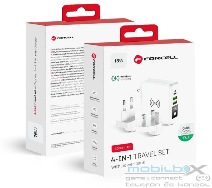 A tökéletes utazási készlet: FORCELL 5 az 1-ben multitöltő. Beépített USB-C és USB-A csatlakozókkal, valamint power bankkal rendelkezik. Lehetővé teszi a vezeték nélküli töltést. Beépített töltőkábelek: USB-C, Lightning (iPhone kompatibilis), amely lehetővé teszi több különböző eszköz egyidejű töltését. A második kábel hibrid - két csatlakozót egyesít egyben: