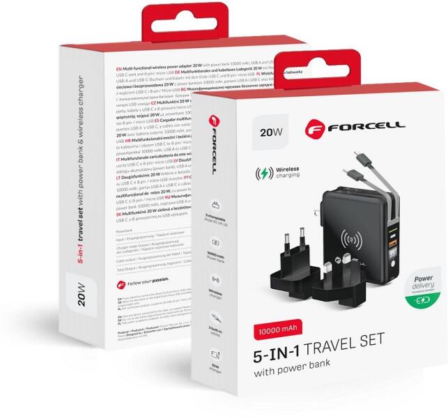 The perfect travel set: FORCELL 4in1 multi-charger. Equipped with built-in ports: USB, USB-C, and a power bank. It allows inductive charging. Built-in ports: 2x USB and USB C, allow simultaneous charging to several different devices. 3 interchangeable tips: UK, US, EU, allows you to use various power sources almost anywhere in the world. Wireless charging allows you to charge devices without havin