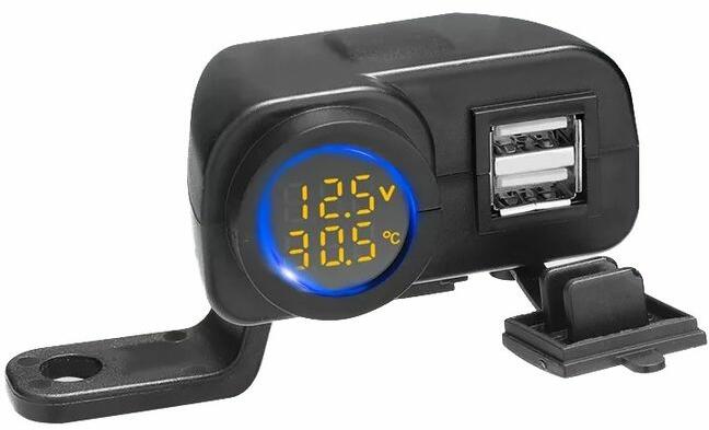Vízálló motorkerékpár-töltő tükrös tartóval. A töltő rendelkezik hálózati kapcsolóval, fedélzeti feszültségjelzővel, kijelzi az aktuális hőmérsékletet, és két USB-A kimenettel rendelkezik, amelyek maximális teljesítménye 2×18W. Az univerzális vízálló töltőmotorkerékpárokon és ATV-ken használható. A töltő aerodinamikus formájú. Az előlapon egy informatí