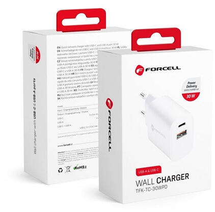 Modern és gyors hálózati töltő két USB-C és USB-A porttal. Lehetővé teszi akár 30 W teljesítményű eszközök táplálását. Támogatja a Power Delivery és a Quick Charge 4.0 gyorstöltési technológiát. Két eszköz egyidejű gyorstöltése A töltőben két port található: USB-C és USB-A. A Power Delivery és a Quick Charge 4.0 technológia támogatása minimálisra csökkenti