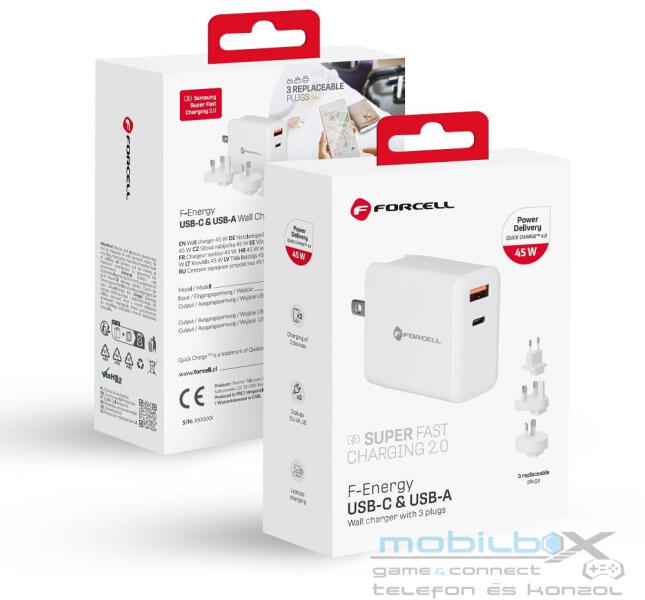 Forcell wall charger with a total power output of 45 W and 3 replaceable plugs (EU, UK, US). It supports Quick Charge 4.0 and Power Delivery charging standards and allows the charging of phones, tablets, and laptops. It features two ports - USB-A and USB-C. Charges two devices simultaneously The Forcell charger has two ports - USB-C (45 W) and USB-A (18 W) - which allow you to replenish energy in