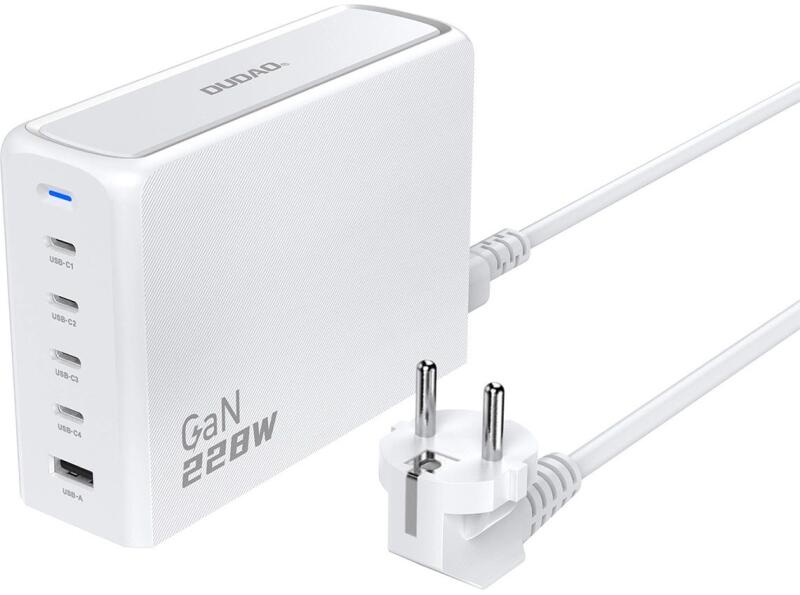 Dudao A228EU GaN töltő 1 USB-A és 4 USB-C porttal - fehér A Dudao A228EU GaN töltő a legújabb GaN technológiával van felszerelve. Támogatja a Power Delivery technológiát és akár 228W teljesítményt is biztosít, így páratlan töltési sebességet nyújt eszközeinek. Egy USB-A és négy USB-C porttal rendelkezik, amelyek egyszerre négy eszközt képesek tölteni. A beépített bi