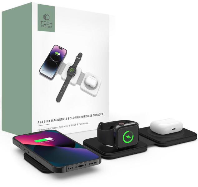TECH-PROTECT QI15W-A24 3IN1 mágneses MAGSAFE vezeték nélküli töltő- fekete A Tech-Protect multifunkcionális töltő lehetővé teszi három eszköz egyidejű vagy teljesen külön - egy MagSafe funkcióval ellátott iPhone, Airpods és Apple Watch - egyidejű töltését. 14 napig meggondolhatod magad és visszaküldheted 4 féle fizetési mód 6 féle szállítási mód TECH-PROTECT QI15W-