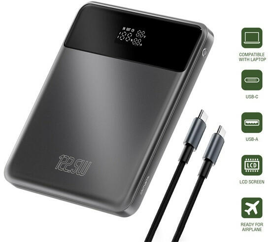 UNIVERZÁLIS ÉS ERŐSFedezze fel a mindennapi élet erejét akkumulátorunkkal! A laptopokhoz való 2 USB-C porttal (100 W) és 2 USB-A porttal (22,5 W) olyan eszközökhöz, mint például az okosórák vagy a TWS headsetek, a powerbank mindig elegendő energiát biztosít 122,5 W összteljesítménnyel. Maradjon mobil, maradjon kapcsolatban, maradjon feltöltve! Lenyűgöző, 122,5 W-os teljes
