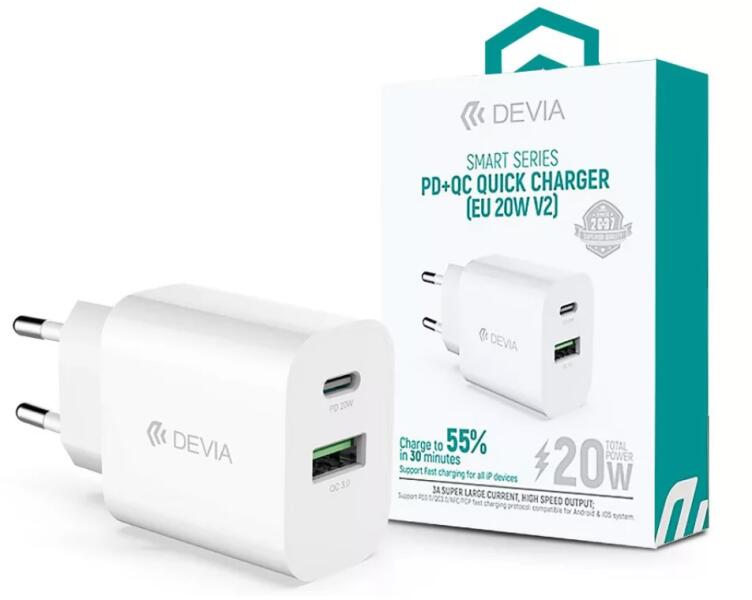 - A Devia Smart egy fejlett fali töltő 2,4 A maximális áramerősséggel, két USB-A porttal felszerelve. - Elegendő energiát biztosít a legnagyobb mobileszközök töltéséhez is, és egy kiegészítő USB-C kábel lehetővé teszi, hogy a vásárlás után azonnal használhassa. - A klasszikus megjelenés minden típusú belső térhez illik, a minőségi kivitelezés pedig arról árulko