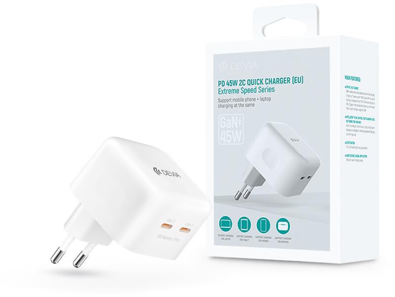 DEVIA GAN HÁLÓZATI TÖLTŐ ADAPTER 2XTYPE-C BEMENETTEL - 45W - DEVIA EXTREME SPEEDSERIES PD 45W 2C QUICK CHARGER - WHITE Mind a mobiltelefon, mind a notebook gyorsan feltölthető egy porton max 45W-os támogatással Apple iPhone gyorstöltés egy porton max 27 W, 30 perc töltés 60 % -ra Két eszköz egyidejű gyorstöltésének támogatása max. 20 W + 25 W. Jellemzők: Támogatja a laptop t