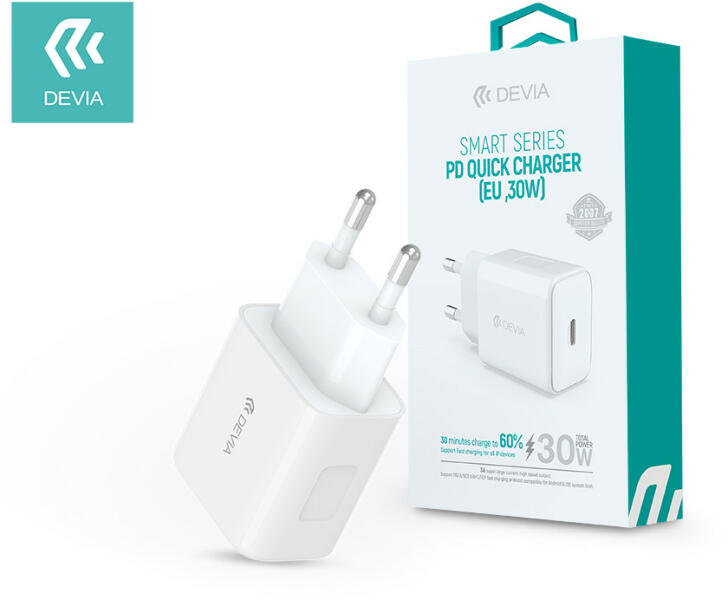 DEVIA HÃLÃZATI TÃLTà ADAPTER TYPE-C BEMENETTEL - 30W - DEVIA SMART SERIES PD3.0 QUICK CHARGER - WHITE   JellemzÃk:  Anyag: TÃzálló PC anyag TeljesÃtmény: 30W Töltési sebesség: 2x sebesség, fél óra alatt a teljes töltésà eszköz 60% -a Bemenet: AC 110-240V 50 / 60Hz 0,8A Type-C kimenet: 5V / 3A, 9V / 3A, 12V / 2,5A, 15V / 2A, 20V / 1,5A, 3,
