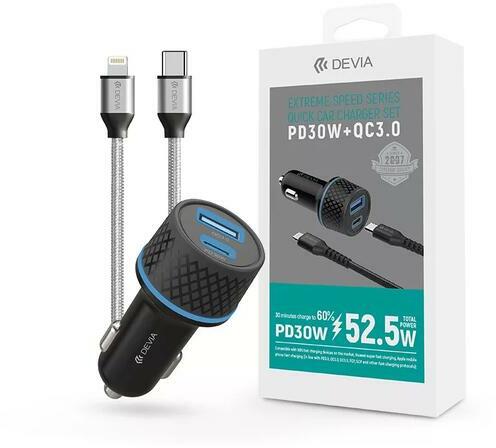 Devia autós töltő USB-A + Type-C aljzat + Lightning kábel, Extreme Speed Series, QC3, PD30W, fekete