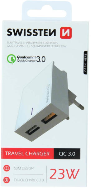 Swissten hálózati gyors töltő adapter, Qualcomm 3.0 technológiával, 2 USB porttal ellátva, fehér színben. Vidd magaddal bárhova ezt a könnyű, vékony kialakítású, ám mégis erős, minőségi anyagokból készült 23W-os hálózati töltőt, hogy mindig kéznél legyen, amikor készülékeidnek töltésre van szüksége. A termék különlegessége, hogy a tetején lehetőséget kí