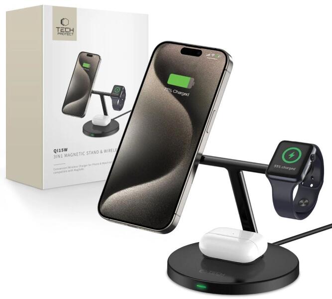 A Tech-Protect A35 multifunkciós induktív töltő lehetővé teszi három eszköz egyidejű vagy teljesen külön töltését - iPhone MagSafe funkcióval, AirPods és Apple Watch. Az egyszerű, de funkcionális kialakítás visszafogott színekben nagyon esztétikus megjelenést kölcsönöz neki. A moduláris kialakításnak köszönhetően az eszközeinket különböző konfigurációkban tö