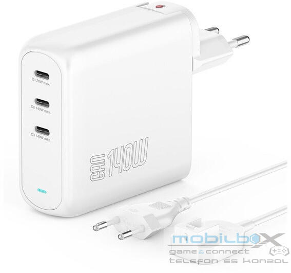 4smarts GaN Flex Pro töltő adapter, 140W, 3xUSB-C, fehér KICSI ÉS KOMPAKT Az erős töltők gyakran meglehetősen nagyok. A mi GaN Charger Flex Pro-nk viszont sokkal kisebb és kompaktabb, mint a többi szokásos. Ezt a legújabb GaN Charger technológia teszi lehetővé. Ez a technológia biztosítja, hogy az elektronikát közelebb tudjuk egymáshoz építeni anélkül, hogy több hőt terme