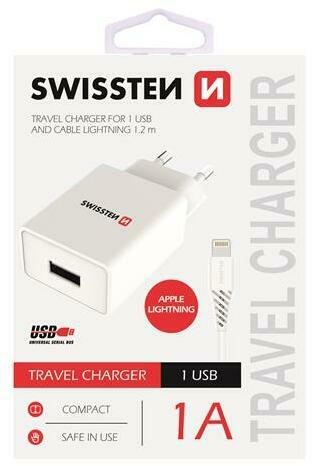Swissten hálózati töltő adapter, 1 A, fehér színben. A csomagolás tartalmaz egy 1,2 méter hosszúságú lightning kábelt is. Információk: Bemeneti feszültség: 100V-240V, 50 Hz-60 Hz Kimenet: DC 5V, 1000 mA Biztonságos használat Könnyű súly 1,2 m hosszú lightning kábel