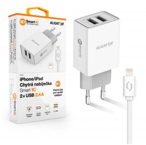 Intelligens hálózati töltő ALIGATOR 2.4A, 2xUSB, smart IC, kábel iPhone/iPad 2A-hoz A "SMART IC" sorozat új nagy teljesítményű hálózati töltője fehér kivitelben, két USB porttal, 2,4 A kimeneti kapacitással. Ez a töltő ideális segítőtárs mobiltelefonja és egyéb készülékei újratöltéséhez. Az intelligens töltővel egyszerre akár két eszköz is tölthető, emellett a