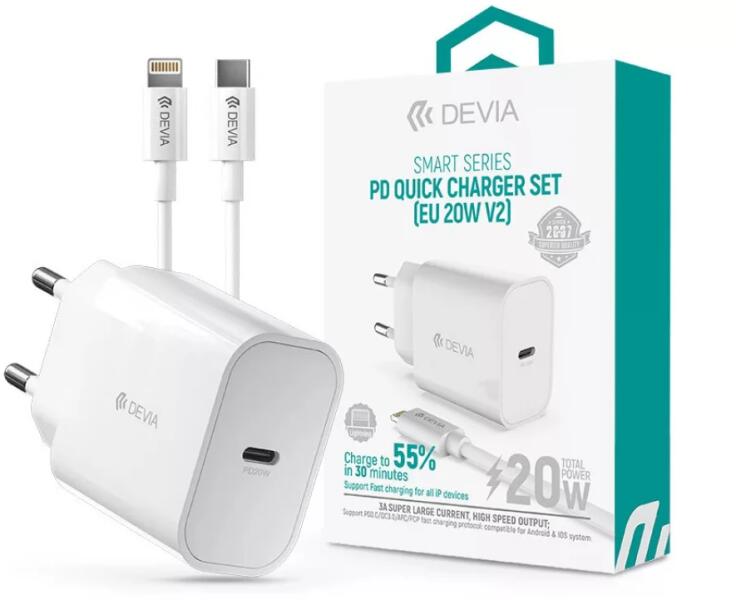 DEVIA ST383847 HÁLÓZATI TÖLTŐ ADAPTER TYPE-C BEMENETTEL + TYPE-C - LIGHTNING KÁBEL - 20W - FEHÉR Töltő: - Bemenet: 100-240V-50/60HZ 0,5A - Kimenet: Type-C: 5V/3A, 9V/2.22A, 12V/1,66A - Max. teljesítmény: 20W - Anyag: tűzálló PC - Szín: Fehér - Súly: 49 g - Támogatja a PD3.0 / QC3.0 / AFC / FCP gyors töltési protokollt, kompatibilis az Android és az IOS rendszerrel Kábel: - Tö