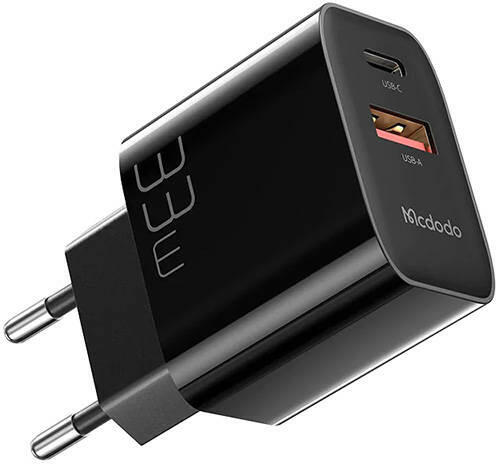 Mcdodo CH-0922 USB + USB-C charger, 33W + USB-C cable (black) The Mcdodo CH-0922 charger will charge your phone, tablet or laptop in no time! Its power is 6x more than the average 5V/1A charger. CH-0922 supports fast charging technology and is compatible with many devices. It is equipped with USB-C and USB-A ports that allow you to charge 2 devices simultaneously. The total output power is 5V/3A.