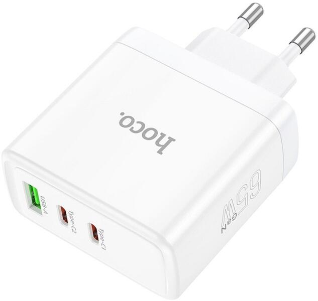 Hoco fali töltő gyorstöltési funkcióval és három porttal: 2 USB-C és USB-A. Lehetővé teszi a mobileszközök gyors töltését. GaN technológiával készült A töltő háromszoros porttal rendelkezik: 2 USB-C (65W) és USB-A (18W) lehetővé teszi 3 eszköz egyidejű töltését. A termék támogatja a PD, QC 3.0, PPS, FCP, AFC és más gyorstöltési megoldásokat. A lángálló PC-b