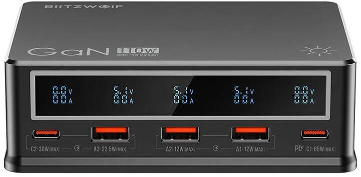 BlitzWolf BW-i9 asztali töltő, 110W, PD, 3xUSB-A, 2xUSB-C (fekete)A modern technológia korában, amikor minden eszköznek szüksége van egy megbízható áramforrásra, a Blitzwolf BW-i9 110W PD töltő sokoldalúságával és hatékonyságával kitűnik a konkurencia közül. Nagy teljesítményű 110 W-os kimeneti teljesítményével és a töltési protokollok széles skálájának támogat