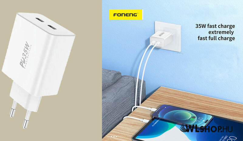 Foneng EU50 mains charger, PD35W (white) The state-of-the-art Foneng EU50 power charger PD35W will allow you to charge two devices simultaneously. Equipped with 2 USB-C ports, it supports fast charging protocols, so all it takes is a short charging break to get your devices ready to go again. Equipped with a high-end sensor, it recognizes connected devices and intelligently distributes current, en