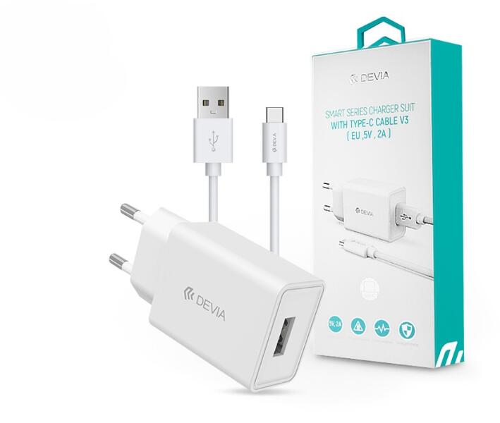 DEVIA SMART USB HÁLÓZATI TÖLTÕ ADAPTER + USB TYPE-C KÁBEL 1 M-ES VEZETÉKKEL - DEVIA SMART SERIES CHARGER SUIT WITH TYPE-C CABLE V3 - 5V/2A - WHITE Kábel: Kábel funkciók: USB Type-C 2.0 Teljesítmény: 2A (MAX) Anyag: Tiszta rézhuzal + PET Interfész típusa: C-típusú portok Hossza: 1 M . Töltõ Anyag: PC + ABS Bemenet: 110-240V Kimenet: 5V-2A Biztonsági tanúsítvány: CE, FCC, UKC