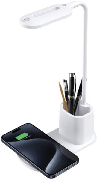 Rebeltec W601 - univerzális asztali LED lámpa tolltartóval, Qi vezeték nélküli töltéssel, 15W fehér. Maximális teljesítmény 15W. LED lámpa 3 fénymóddal, rugalmas fejpánt, 250 lumen, 2,5W teljesítmény. Üzemmódok: meleg 3100K / hideg 6600K / 50% meleg 3100K. A csomag része 1db 1m USB / Micro USB kábel. FONTOS! A termék megrendelése előtt kérjük mindenképpen ellenőrizze,