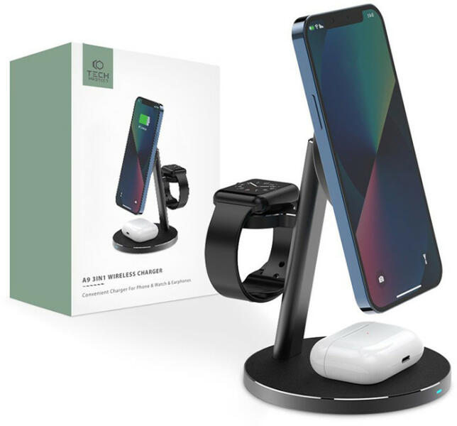 - A könnyű, mégis stabil Tech-Protect A9 töltőállomás a MagSafe technológiával rendelkező Apple iPhone és az olyan kiegészítők, mint az Airpods vagy az Apple Watch számára egyaránt alkalmas. - Az állvány három töltőhelyet tartalmaz, amelyek külön-külön vagy egyszerre is használhatók. - A beépített mágnes lehetővé teszi, hogy a töltő tökéletesen illeszkedjen a t