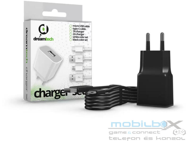 Dreamtech Charger Set 2A Usb C Black Univerzális egy USB-s töltőfej 2A teljesítménnyel + Type-C csatlakozós kábel szettben, fekete színben, a képen látható csomagolásban.