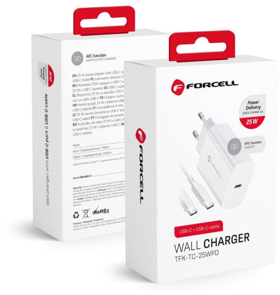 A Forcell Wallcharger 25W Type C töltőfej gyors és hatékony töltést biztosít többféle eszköz számára. Kompatibilis különböző telefonokhoz és tabletekhez, biztonságos és megbízható használatot nyújt. Gyártó:ForcellTöltő típusa:Hálózati töltőSzín:fehérKábel:USB-C - USB-CGyors töltési szabványok:Power Delivery, Quick Charge 4.0Maximális teljesítmény (W):25Maxi