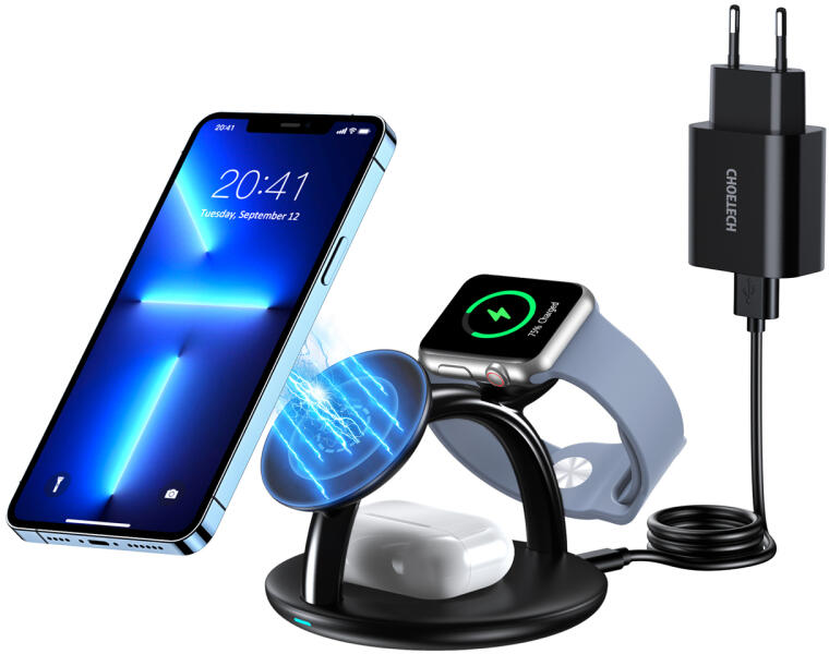 Choetech T587-F 3-in-1 magnetic inductive charger stand for Apple iPhone/Airpods/Apple Watch 15W/5W/2.5W. Choetech T587-F is an innovative 3-in-1 magnetic inductive charger designed specifically for iPhone, AirPods and Apple Watch. Made of high-quality materials, including aluminum alloy and PC, it guarantees durability and stability. In addition, it can act as a phone stand. Compatible Thanks to