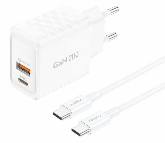 Foneng EU56 1xUSB-A, 1xUSB-C, 20W Power Charger (White) + USB-C cable Foneng EU56 1xUSB-A, 1xUSB-C, 20W Power Charger + USB-C cable is an advanced fast charging device that provides maximum performance with GaN (gallium nitride) technology. It supports 20W of power, as well as numerous fast charging protocols such as PD2.0/3.0, QC2.0/3.0, AFC, FCP and PPS, making it compatible with most devices on