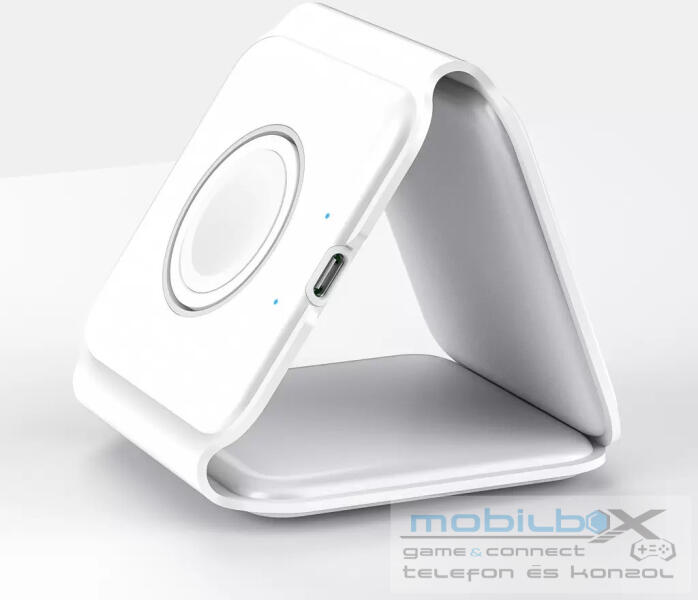 XPRO összehajtható 3in1 vezetéknélküli töltő MagSafe 15W fehér Minden az egyben összecsukható, vezeték nélküli töltő, a mobiltelefonok nélkülözhetetlen kelléke A 3 az 1-ben vezeték nélküli töltés háromféleképpen: 1. Használja lapjára fektetve, helyezze az asztalra, és egyszerre töltse fel vele a telefont, az iWatch-ot és az AirPod-ot. 2. Hajtsa össze egy állványb