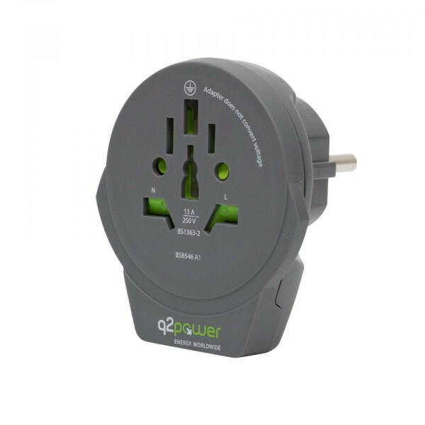 Európába utazik és nem akar bajlódni a töltők és adapterek sokaságával? A q2power 1.100110-TH utazóadapter a megoldás. Ez az innovatív adapter lehetővé teszi, hogy az AUS/CHINA, IT, UK, CH, BRAZIL, USA, EURO (csak földeletlen) szabványú csatlakozókat a GS szabvány szerinti európai aljzatokba csatlakoztassa. Az extra USB csatlakozóval egyszerűen töltheti mobil eszközeit ané