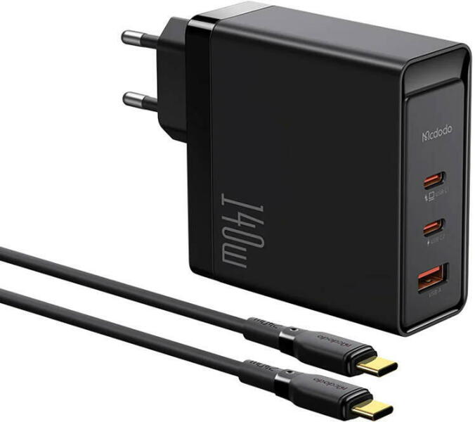 GaN 140W mains charger Mcdodo CH-2913 2x USB-C, USB-A (black) Want to charge your gear quickly and safely? The Mcdodo mains charger can help you do just that! It has been constructed with the latest technologies, such as fast charging with 140W power and GaN5 Pro technology. With three outputs - 2 x USB-C and 1 x USB-A - it is able to handle various devices simultaneously, offering safe and effici
