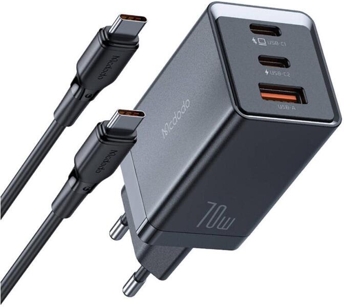 GaN Mcdodo CH-1543 mains charger, 2x USB-C, 1x USB, 67 W + USB-C to USB-C 2 m cable (black) The Mcdodo CH-1543 charger offers a maximum output power of 70 watts. It is ideal for charging a wide range of devices, including laptops, smartphones, Nintendo Switch consoles and headphones. It is made of PC V0 material, and its compact dimensions of 32 × 37.1 × 95.4 mm and weight of 107.7 grams make it