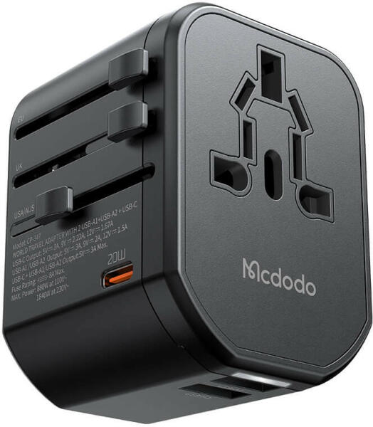 Mcdodo CP-3471 universal EU/US/AU/UK power charger, PD 20W (black) Do you travel often? Don't sacrifice the ability to conveniently charge and power your devices! The Mcdodo CP-3471 universal power charger offers different types of plugs - EU, US, AU and UK. To use any of them, just move the corresponding slider! The product provides up to 20W of power and has 3 ports - 1x USB-C and 2x USB-A. It c
