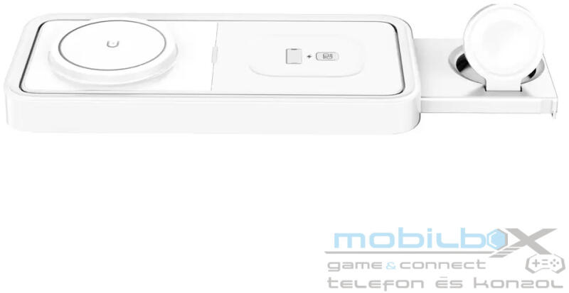 XPRO 3in1 vezeték nélküli QI mágneses MagSafe gyorstöltő 15W fehér 3in1 mágneses vezeték nélküli töltő Mobiltelefon, airpods, iWatch egyszerre tölthető Innovatív fiók típusú megoldás az okosóra töltéséhez, nyomja meg az eszköz oldalán található jelzést, és kinyílik plusz egy töltőrész az okosórához. Bemenet: PD/QC3.0/9V-4A Telefon vezeték nélküli töltéséne