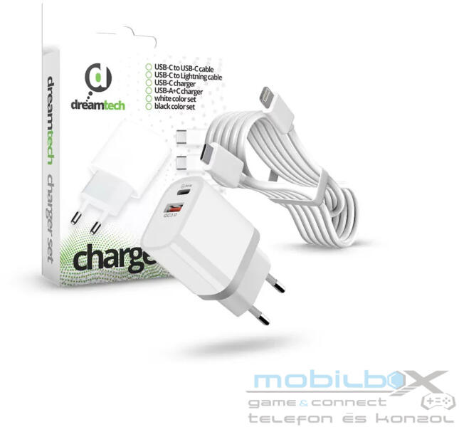 Dreamtech PD Charger Set USB-C+A 20W+QC3.0-s adapterrel és USB-C / Lightning kábellel FEHÉR Dreamtech USB-C+A-s töltőfej 20W + QC3.0 teljesítménnyel + USB-C to Lightning csatlakozós kábel szettben, fehér színben, a képen látható csomagolásban.
